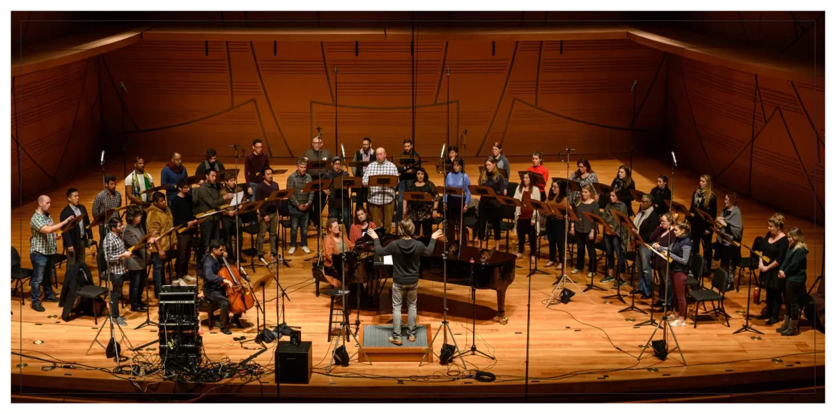 Eric Whitacre recording "The Sacred Veil" with Los Angeles Master Chorale, Lisa Edwards (piano), Jeffrey Zeigler (cello). © Eric Whitacre/Jamie Pham